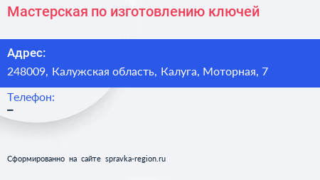 Мастерская по изготовлению ключей по адресу 248009, Калужская область, Калуга, Моторная, 7 в дальнейшем Организация, размещена в следующих категориях: