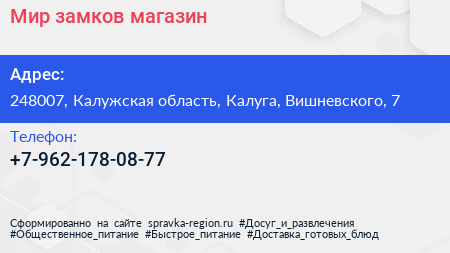 Мир замков, магазин по адресу 248007, Калужская область, Калуга, Вишневского, 7 в дальнейшем Организация, размещена в следующих категориях: