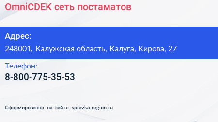 OmniCDEK, сеть постаматов по адресу 248001, Калужская область, Калуга, Кирова, 27 в дальнейшем Организация, размещена в следующих категориях: