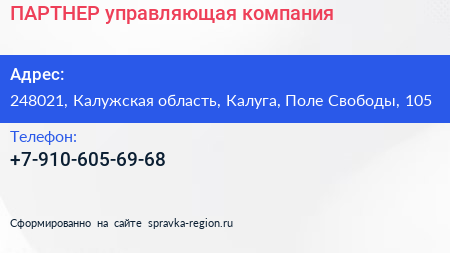 ПАРТНЕР, управляющая компания по адресу 248021, Калужская область, Калуга, Поле Свободы, 105 в дальнейшем Организация, размещена в следующих категориях: