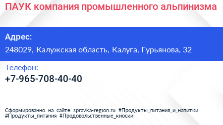 ПАУК, компания промышленного альпинизма по адресу 248029, Калужская область, Калуга, Гурьянова, 32 в дальнейшем Организация, размещена в следующих категориях: