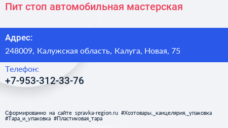Пит стоп, автомобильная мастерская по адресу 248009, Калужская область, Калуга, Новая, 75 в дальнейшем Организация, размещена в следующих категориях: