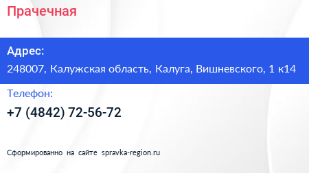 Прачечная по адресу 248007, Калужская область, Калуга, Вишневского, 1 к14 в дальнейшем Организация, размещена в следующих категориях: