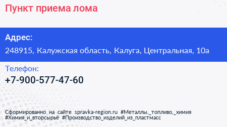 Пункт приема лома по адресу 248915, Калужская область, Калуга, Центральная, 10а в дальнейшем Организация, размещена в следующих категориях: