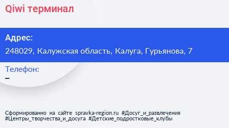 Qiwi, терминал по адресу 248029, Калужская область, Калуга, Гурьянова, 7 в дальнейшем Организация, размещена в следующих категориях: