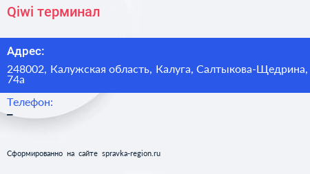 Qiwi, терминал по адресу 248002, Калужская область, Калуга, Салтыкова-Щедрина, 74а в дальнейшем Организация, размещена в следующих категориях: