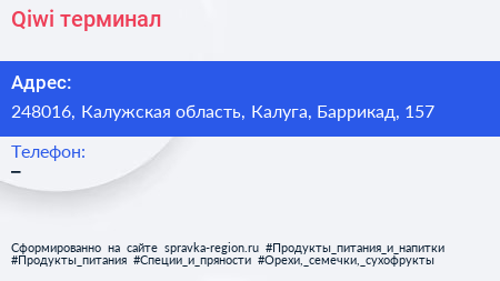 Qiwi, терминал по адресу 248016, Калужская область, Калуга, Баррикад, 157 в дальнейшем Организация, размещена в следующих категориях: