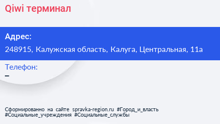 Qiwi, терминал по адресу 248915, Калужская область, Калуга, Центральная, 11а в дальнейшем Организация, размещена в следующих категориях: