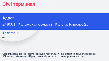 Qiwi, терминал по адресу 248001, Калужская область, Калуга, Кирова, 25 в дальнейшем Организация, размещена в следующих категориях: