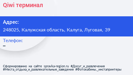 Qiwi, терминал по адресу 248025, Калужская область, Калуга, Луговая, 39 в дальнейшем Организация, размещена в следующих категориях: