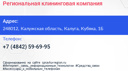 Региональная клининговая компания по адресу 248012, Калужская область, Калуга, Кубяка, 1Б в дальнейшем Организация, размещена в следующих категориях: