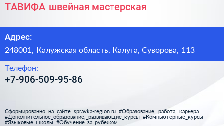 ТАВИФА, швейная мастерская по адресу 248001, Калужская область, Калуга, Суворова, 113 в дальнейшем Организация, размещена в следующих категориях: