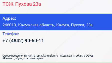 ТСЖ Пухова, 23а по адресу 248010, Калужская область, Калуга, Пухова, 23а в дальнейшем Организация, размещена в следующих категориях: