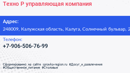 Техно-Р, управляющая компания по адресу 248009, Калужская область, Калуга, Солнечный бульвар, 2 в дальнейшем Организация, размещена в следующих категориях: