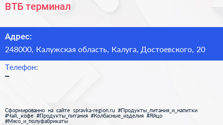 ВТБ, терминал по адресу 248000, Калужская область, Калуга, Достоевского, 20 в дальнейшем Организация, размещена в следующих категориях: