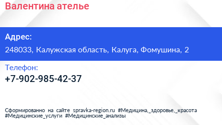 Валентина, ателье по адресу 248033, Калужская область, Калуга, Фомушина, 2 в дальнейшем Организация, размещена в следующих категориях: