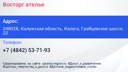 Восторг, ателье по адресу 248018, Калужская область, Калуга, Грабцевское шоссе, 22 в дальнейшем Организация, размещена в следующих категориях: