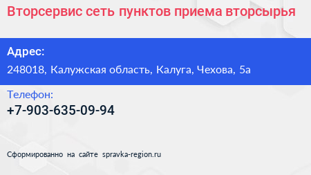 Вторсервис, сеть пунктов приема вторсырья по адресу 248018, Калужская область, Калуга, Чехова, 5а в дальнейшем Организация, размещена в следующих категориях: