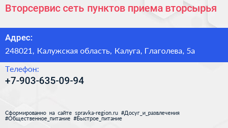 Вторсервис, сеть пунктов приема вторсырья по адресу 248021, Калужская область, Калуга, Глаголева, 5а в дальнейшем Организация, размещена в следующих категориях: