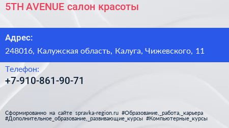 5TH AVENUE, салон красоты по адресу 248016, Калужская область, Калуга, Чижевского, 11 в дальнейшем Организация, размещена в следующих категориях: