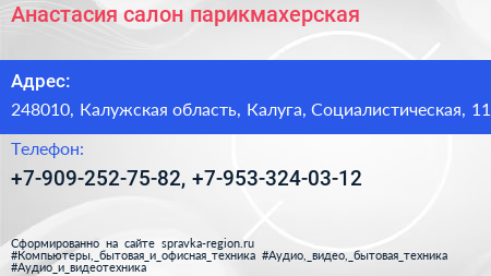 Анастасия, салон-парикмахерская по адресу 248010, Калужская область, Калуга, Социалистическая, 11 в дальнейшем Организация, размещена в следующих категориях: