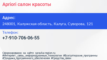 Apriori, салон красоты по адресу 248001, Калужская область, Калуга, Суворова, 121 в дальнейшем Организация, размещена в следующих категориях: