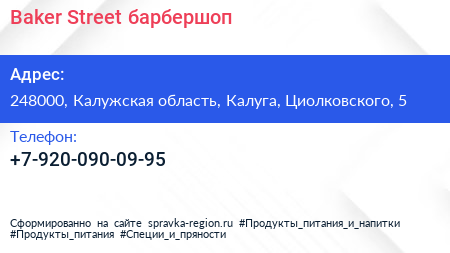 Baker Street, барбершоп по адресу 248000, Калужская область, Калуга, Циолковского, 5 в дальнейшем Организация, размещена в следующих категориях: