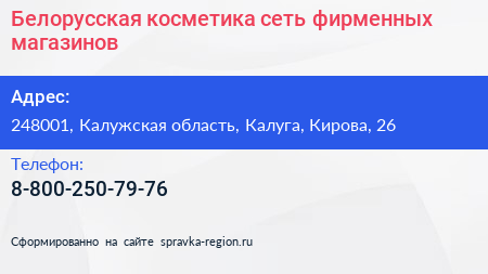 Белорусская косметика, сеть фирменных магазинов по адресу 248001, Калужская область, Калуга, Кирова, 26 в дальнейшем Организация, размещена в следующих категориях: