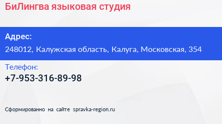БиЛингва, языковая студия по адресу 248012, Калужская область, Калуга, Московская, 354 в дальнейшем Организация, размещена в следующих категориях: