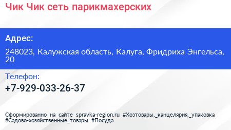 Чик Чик, сеть парикмахерских по адресу 248023, Калужская область, Калуга, Фридриха Энгельса, 20 в дальнейшем Организация, размещена в следующих категориях: