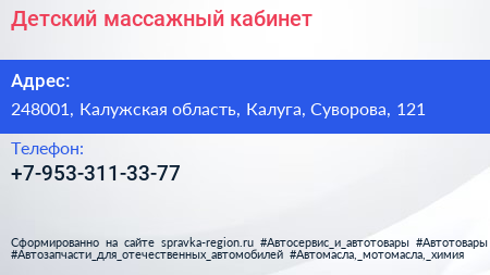 Детский массажный кабинет по адресу 248001, Калужская область, Калуга, Суворова, 121 в дальнейшем Организация, размещена в следующих категориях: