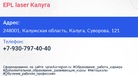 EPL laser Калуга по адресу 248001, Калужская область, Калуга, Суворова, 121 в дальнейшем Организация, размещена в следующих категориях: