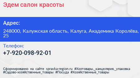 Эдем, салон красоты по адресу 248000, Калужская область, Калуга, Академика Королёва, 25 в дальнейшем Организация, размещена в следующих категориях: