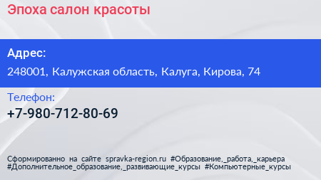 Эпоха, салон красоты по адресу 248001, Калужская область, Калуга, Кирова, 74 в дальнейшем Организация, размещена в следующих категориях: