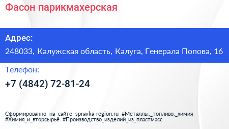 Фасон, парикмахерская по адресу 248033, Калужская область, Калуга, Генерала Попова, 16 в дальнейшем Организация, размещена в следующих категориях: