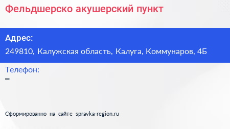 Фельдшерско-акушерский пункт по адресу 249810, Калужская область, Калуга, Коммунаров, 4Б в дальнейшем Организация, размещена в следующих категориях:
