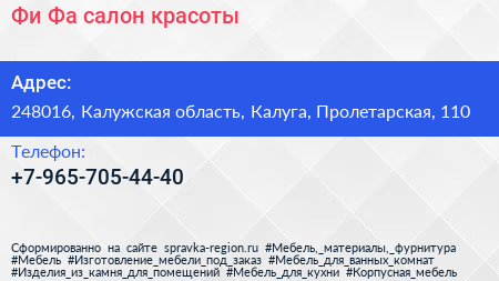 Фи-Фа, салон красоты по адресу 248016, Калужская область, Калуга, Пролетарская, 110 в дальнейшем Организация, размещена в следующих категориях:
