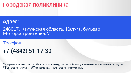 Городская поликлиника по адресу 248017, Калужская область, Калуга, бульвар Моторостроителей, 9 в дальнейшем Организация, размещена в следующих категориях: