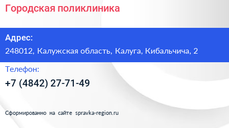 Городская поликлиника по адресу 248012, Калужская область, Калуга, Кибальчича, 2 в дальнейшем Организация, размещена в следующих категориях: