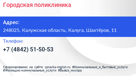 Городская поликлиника по адресу 248025, Калужская область, Калуга, Шахтёров, 11 в дальнейшем Организация, размещена в следующих категориях: