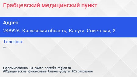 Грабцевский медицинский пункт по адресу 248926, Калужская область, Калуга, Советская, 2 в дальнейшем Организация, размещена в следующих категориях: