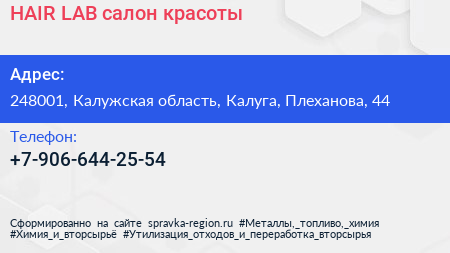 HAIR LAB, салон красоты по адресу 248001, Калужская область, Калуга, Плеханова, 44 в дальнейшем Организация, размещена в следующих категориях: