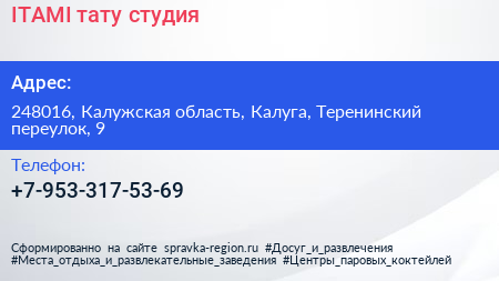 ITAMI, тату-студия по адресу 248016, Калужская область, Калуга, Теренинский переулок, 9 в дальнейшем Организация, размещена в следующих категориях: