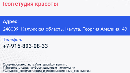Icon, студия красоты по адресу 248039, Калужская область, Калуга, Георгия Амелина, 49 в дальнейшем Организация, размещена в следующих категориях: