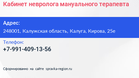 Кабинет невролога, мануального терапевта по адресу 248001, Калужская область, Калуга, Кирова, 25е в дальнейшем Организация, размещена в следующих категориях: