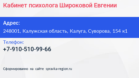 Кабинет психолога Широковой Евгении по адресу 248001, Калужская область, Калуга, Суворова, 154 к1 в дальнейшем Организация, размещена в следующих категориях: