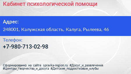 Кабинет психологической помощи по адресу 248001, Калужская область, Калуга, Рылеева, 46 в дальнейшем Организация, размещена в следующих категориях: