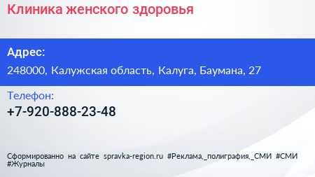 Клиника женского здоровья по адресу 248000, Калужская область, Калуга, Баумана, 27 в дальнейшем Организация, размещена в следующих категориях: