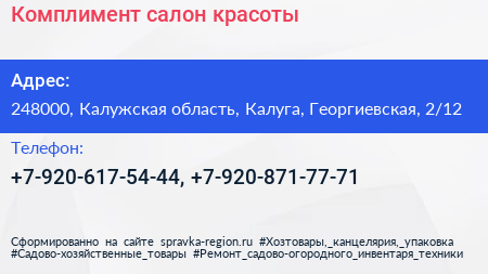 Комплимент, салон красоты по адресу 248000, Калужская область, Калуга, Георгиевская, 2/12 в дальнейшем Организация, размещена в следующих категориях: