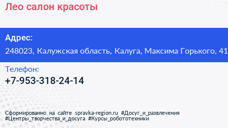 Лео, салон красоты по адресу 248023, Калужская область, Калуга, Максима Горького, 41 в дальнейшем Организация, размещена в следующих категориях:
